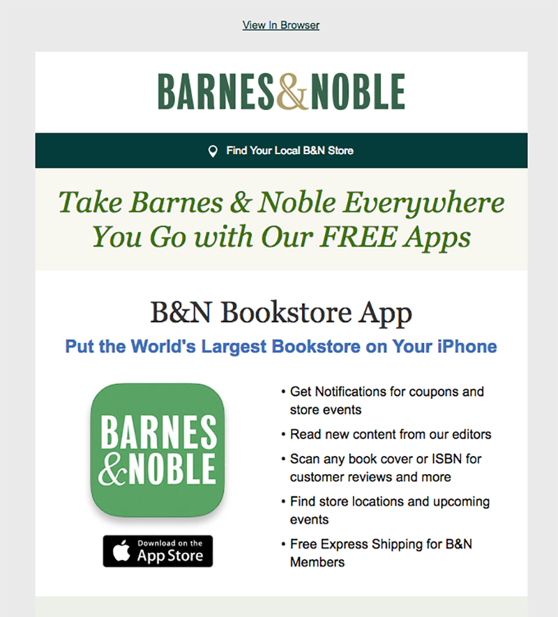 Ein Beispiel: Der Buchhändler Barnes & Nobles. Eine große Menge an Informationen präsentiert das Unternehmen, indem es sie in kleine Stücke aufbricht. Dazu kommen Aufzählungszeichen, die den Inhalt strukturierter und klarer gestalten. Mit grafischen Elementen werten sie den Content auf und trennen Teile der E-Mail voneinander.