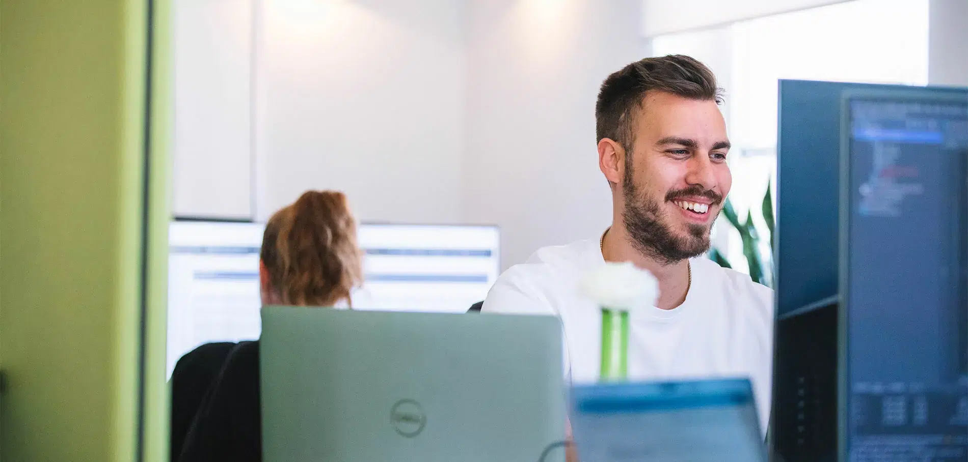 Zwei Mitarbeiter besprechen sich an ihrem Arbeitsplatz in der TYPO3-Agentur
