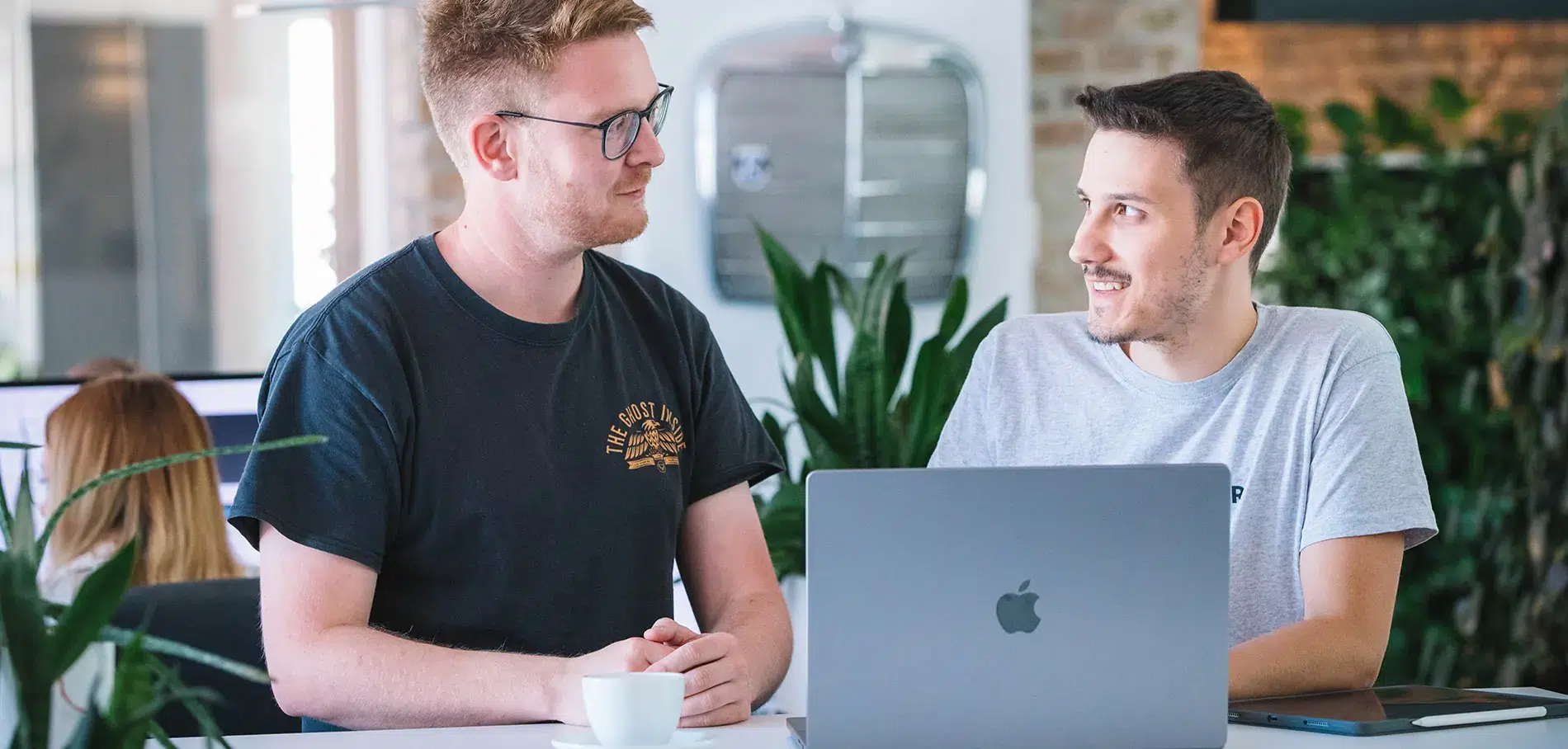 Ein Mitarbeiter unterstützt einen Kollegen bei der Wartung und Aktualisierung einer TYPO3-Website an mehreren Bildschirmen.